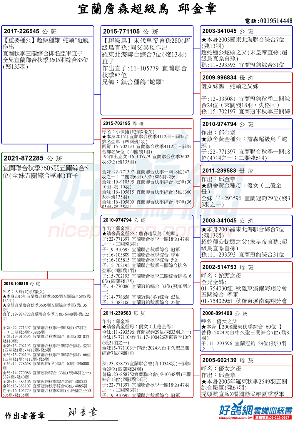 「超級鳥蛇頭」與「上億金母優女」這個黃金組合,為邱金章鴿舍打下穩固的基石,作出不計其數的入賞鴿,為邱金章的海翔成績取得巨大的成就。