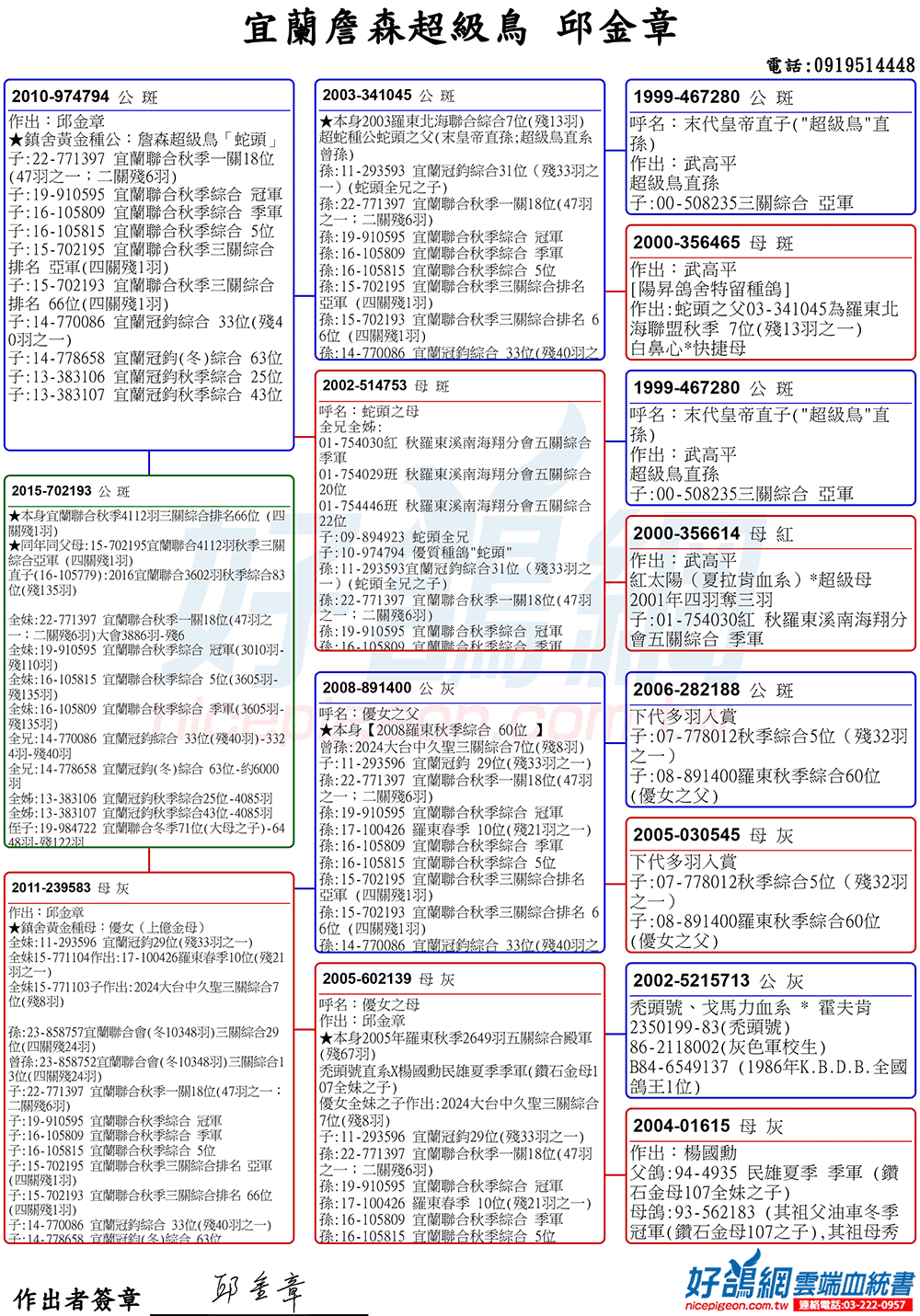 「超級鳥蛇頭」與「上億金母優女」這個黃金組合,為邱金章鴿舍打下穩固的基石,作出不計其數的入賞鴿,為邱金章的海翔成績取得巨大的成就。