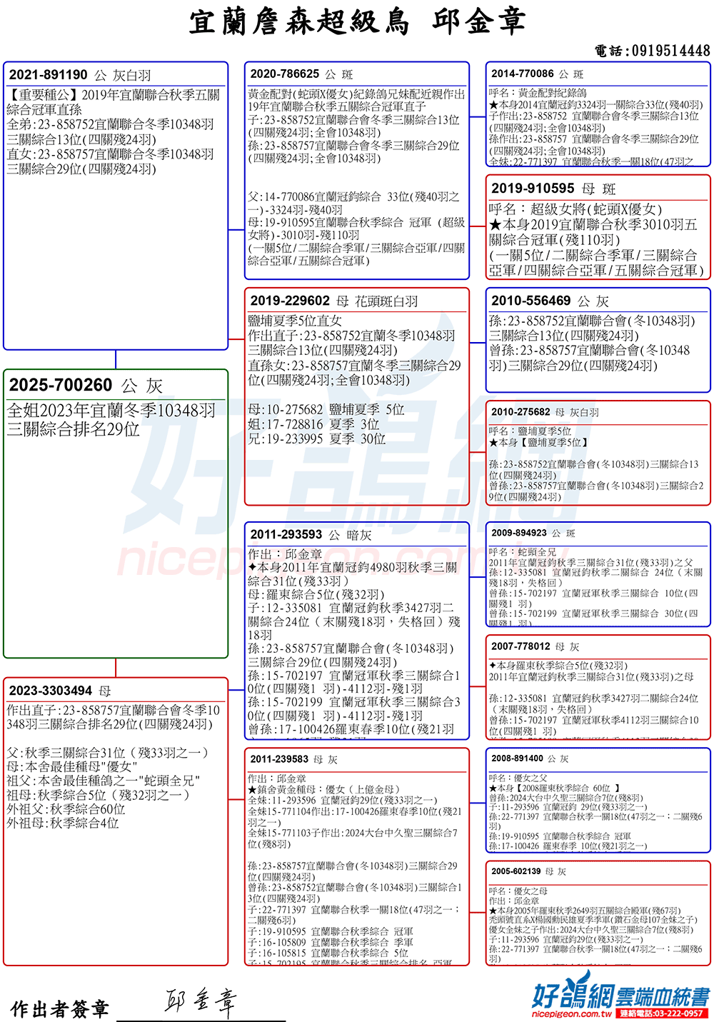 「超級鳥蛇頭」與「上億金母優女」這個黃金組合,為邱金章鴿舍打下穩固的基石,作出不計其數的入賞鴿,為邱金章的海翔成績取得巨大的成就。