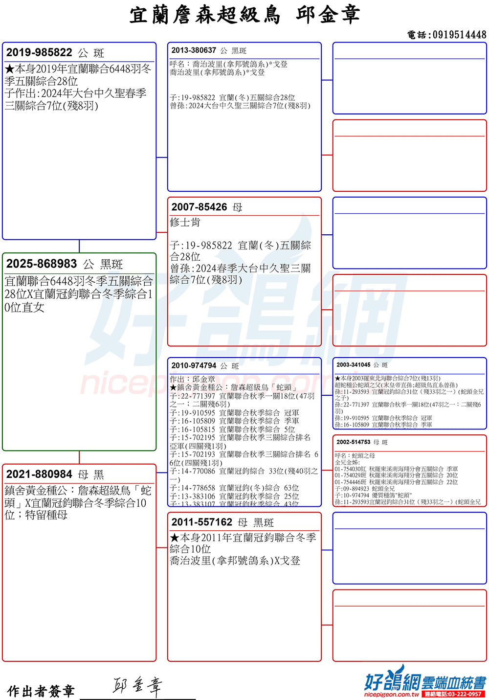 「超級鳥蛇頭」與「上億金母優女」這個黃金組合,為邱金章鴿舍打下穩固的基石,作出不計其數的入賞鴿,為邱金章的海翔成績取得巨大的成就。