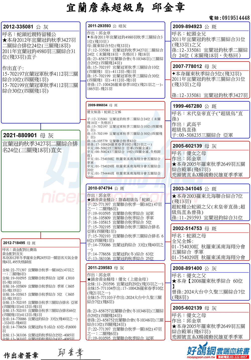 「超級鳥蛇頭」與「上億金母優女」這個黃金組合,為邱金章鴿舍打下穩固的基石,作出不計其數的入賞鴿,為邱金章的海翔成績取得巨大的成就。