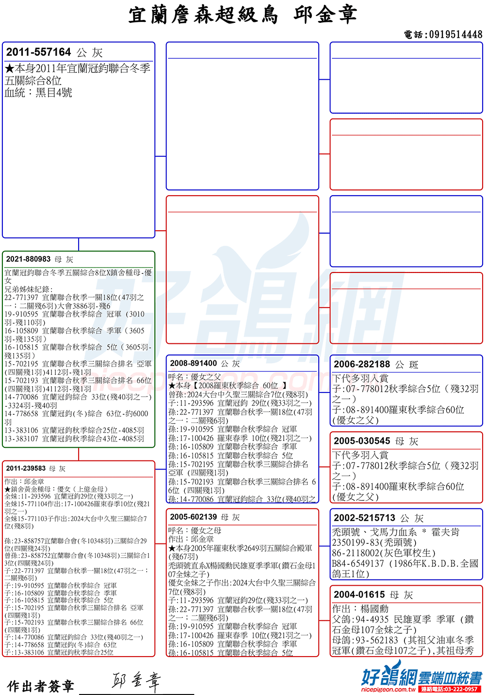 「超級鳥蛇頭」與「上億金母優女」這個黃金組合,為邱金章鴿舍打下穩固的基石,作出不計其數的入賞鴿,為邱金章的海翔成績取得巨大的成就。