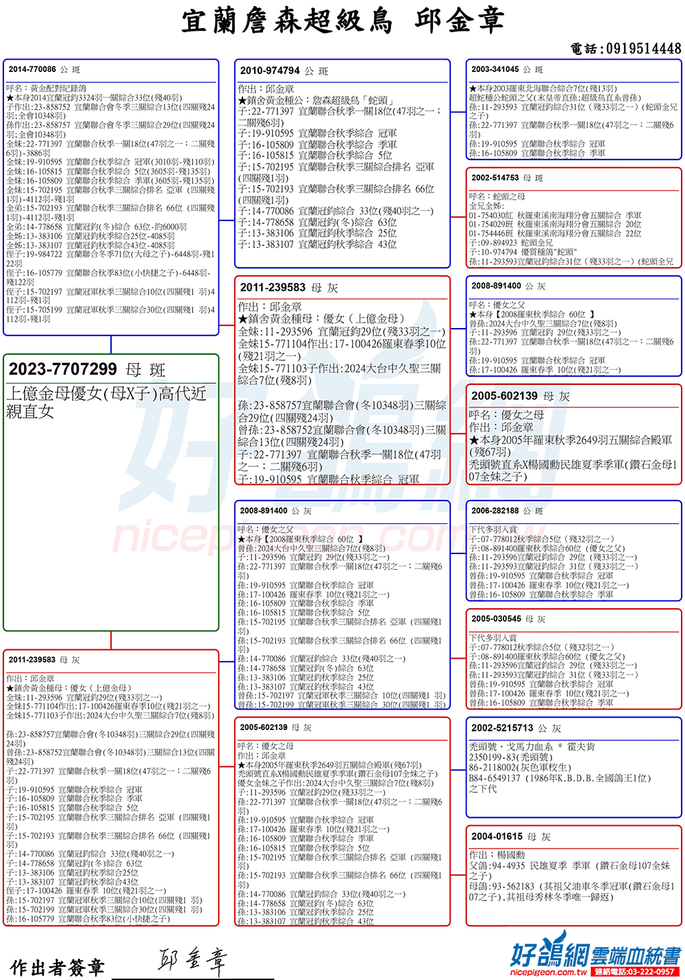 「超級鳥蛇頭」與「上億金母優女」這個黃金組合,為邱金章鴿舍打下穩固的基石,作出不計其數的入賞鴿,為邱金章的海翔成績取得巨大的成就。