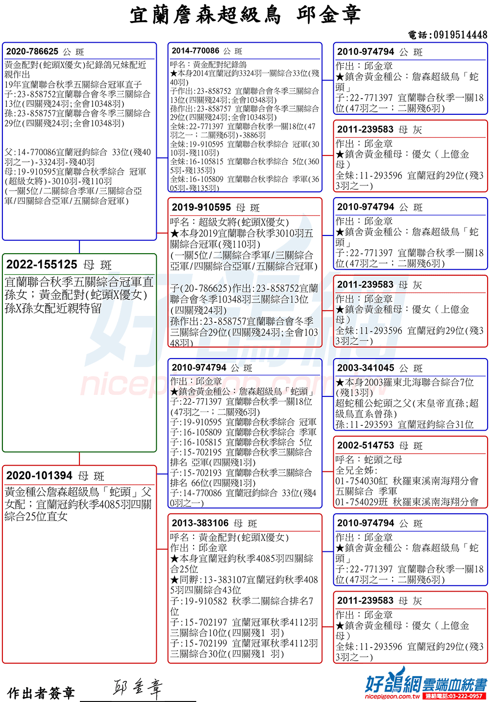 「超級鳥蛇頭」與「上億金母優女」這個黃金組合,為邱金章鴿舍打下穩固的基石,作出不計其數的入賞鴿,為邱金章的海翔成績取得巨大的成就。
