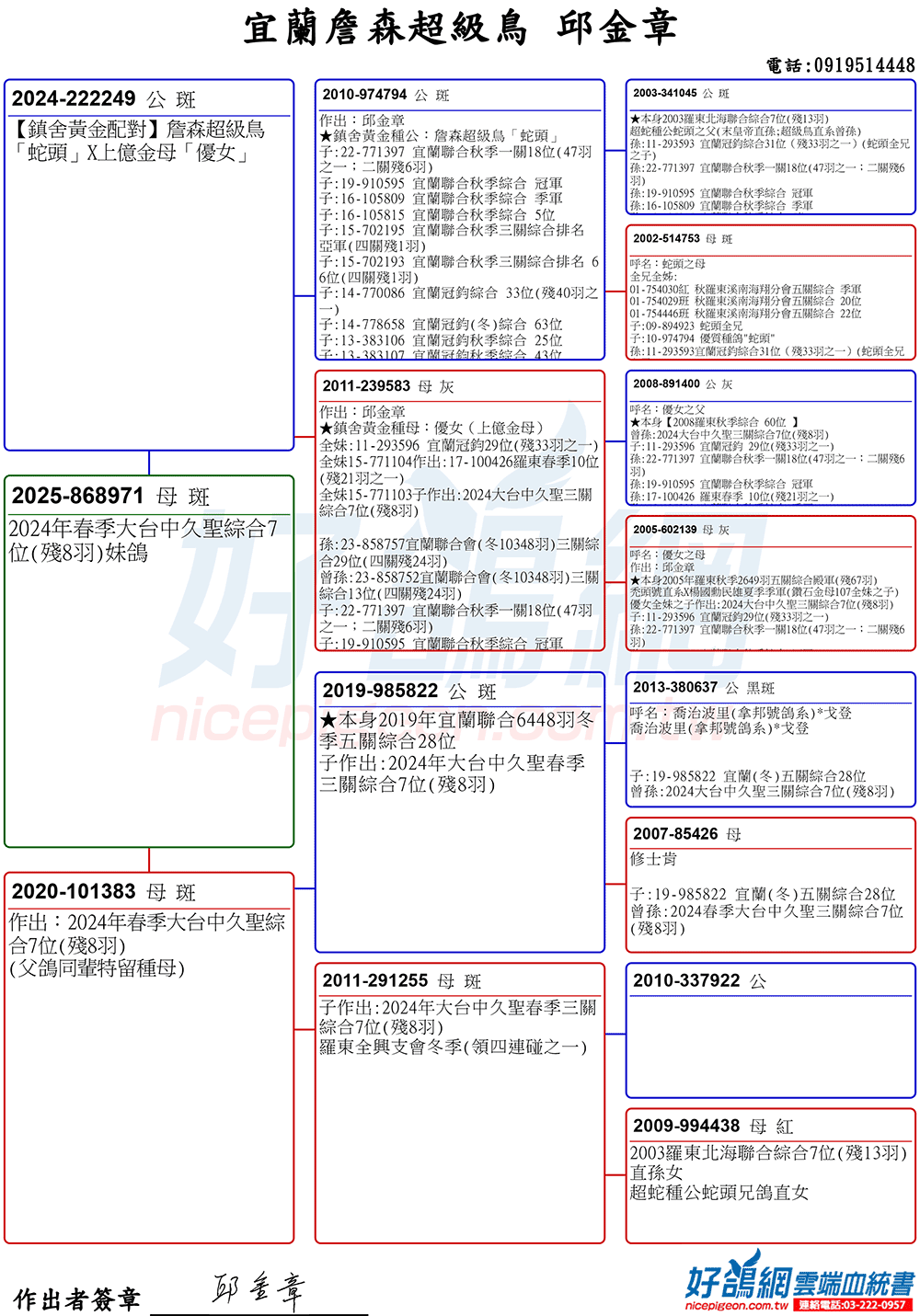 邱金章也導入高雄強豪邱氏兄弟的超級鳥家族,邱氏兄弟的超級鳥家族在南海賽事所向披靡。好的鴿種不分賽季與地區,邱金章引進之後也作出2025年宜蘭夏季2195羽一關綜合排名55位,足可顯示詹森超級鳥不凡的競賽能力。