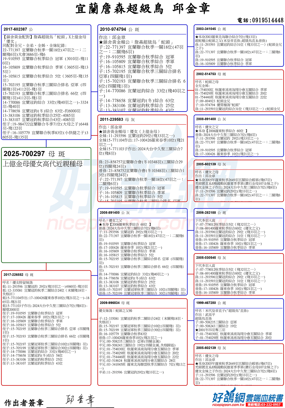 「超級鳥蛇頭」與「上億金母優女」這個黃金組合,為邱金章鴿舍打下穩固的基石,作出不計其數的入賞鴿,為邱金章的海翔成績取得巨大的成就。