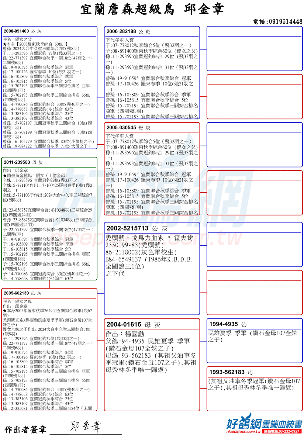 「超級鳥蛇頭」與「上億金母優女」這個黃金組合,為邱金章鴿舍打下穩固的基石,作出不計其數的入賞鴿,為邱金章的海翔成績取得巨大的成就。