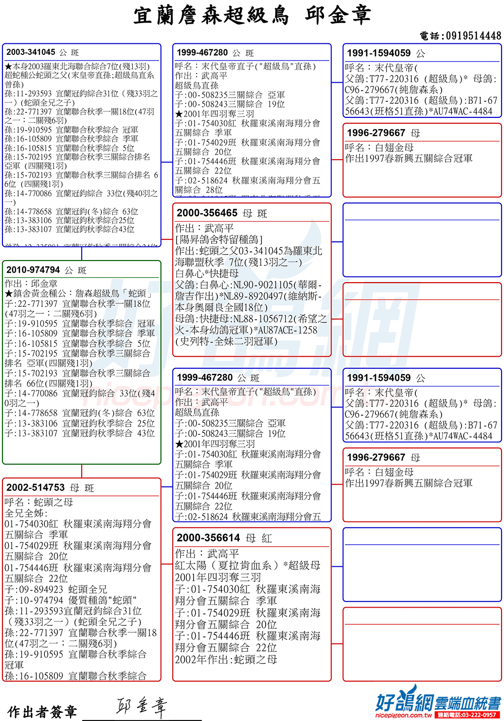 「超級鳥蛇頭」與「上億金母優女」這個黃金組合,為邱金章鴿舍打下穩固的基石,作出不計其數的入賞鴿,為邱金章的海翔成績取得巨大的成就。