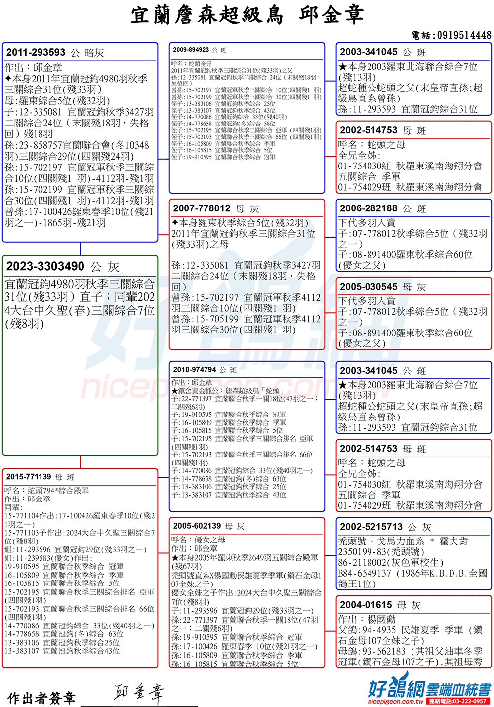 「超級鳥蛇頭」與「上億金母優女」這個黃金組合,為邱金章鴿舍打下穩固的基石,作出不計其數的入賞鴿,為邱金章的海翔成績取得巨大的成就。