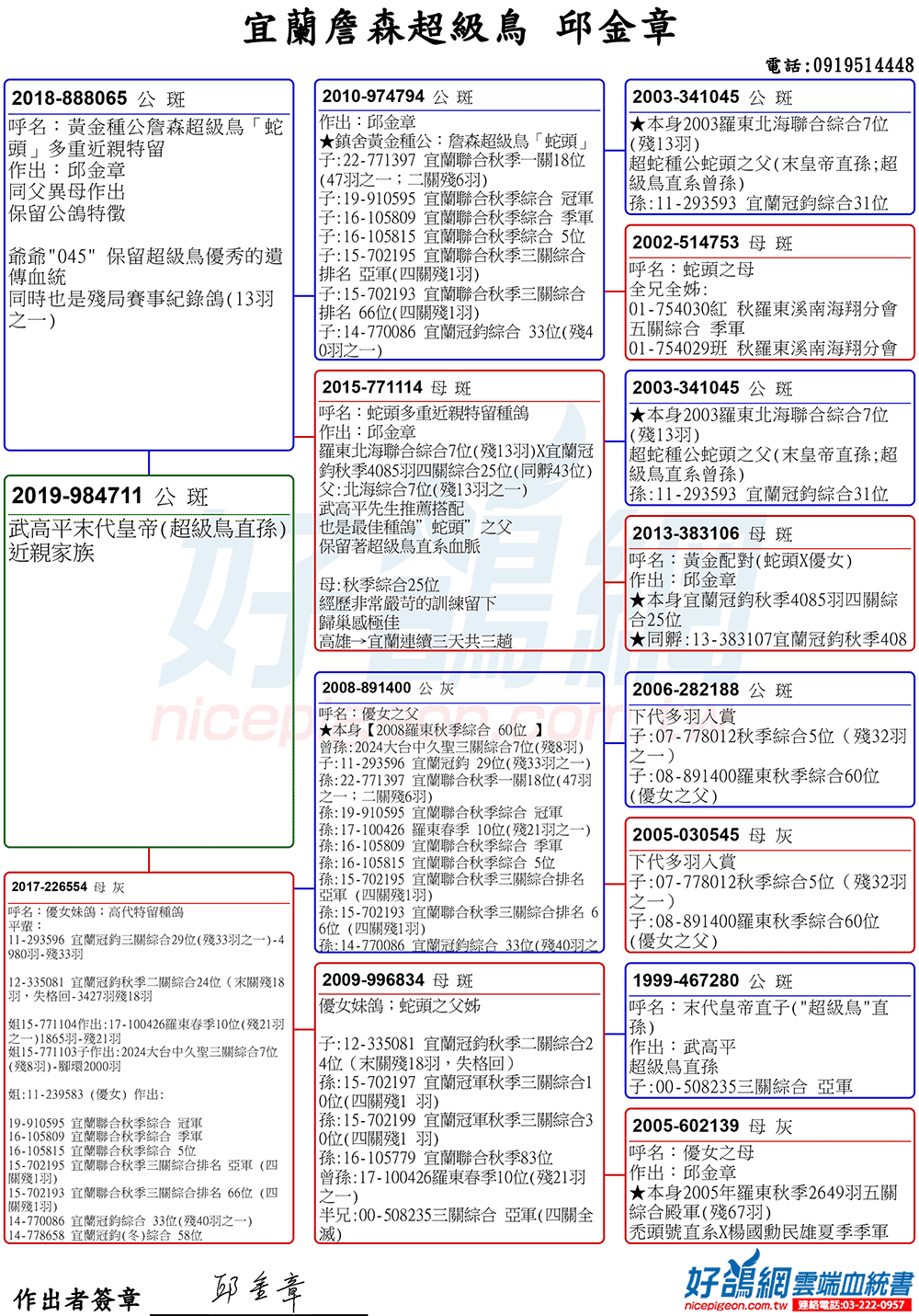 「超級鳥蛇頭」與「上億金母優女」這個黃金組合,為邱金章鴿舍打下穩固的基石,作出不計其數的入賞鴿,為邱金章的海翔成績取得巨大的成就。
