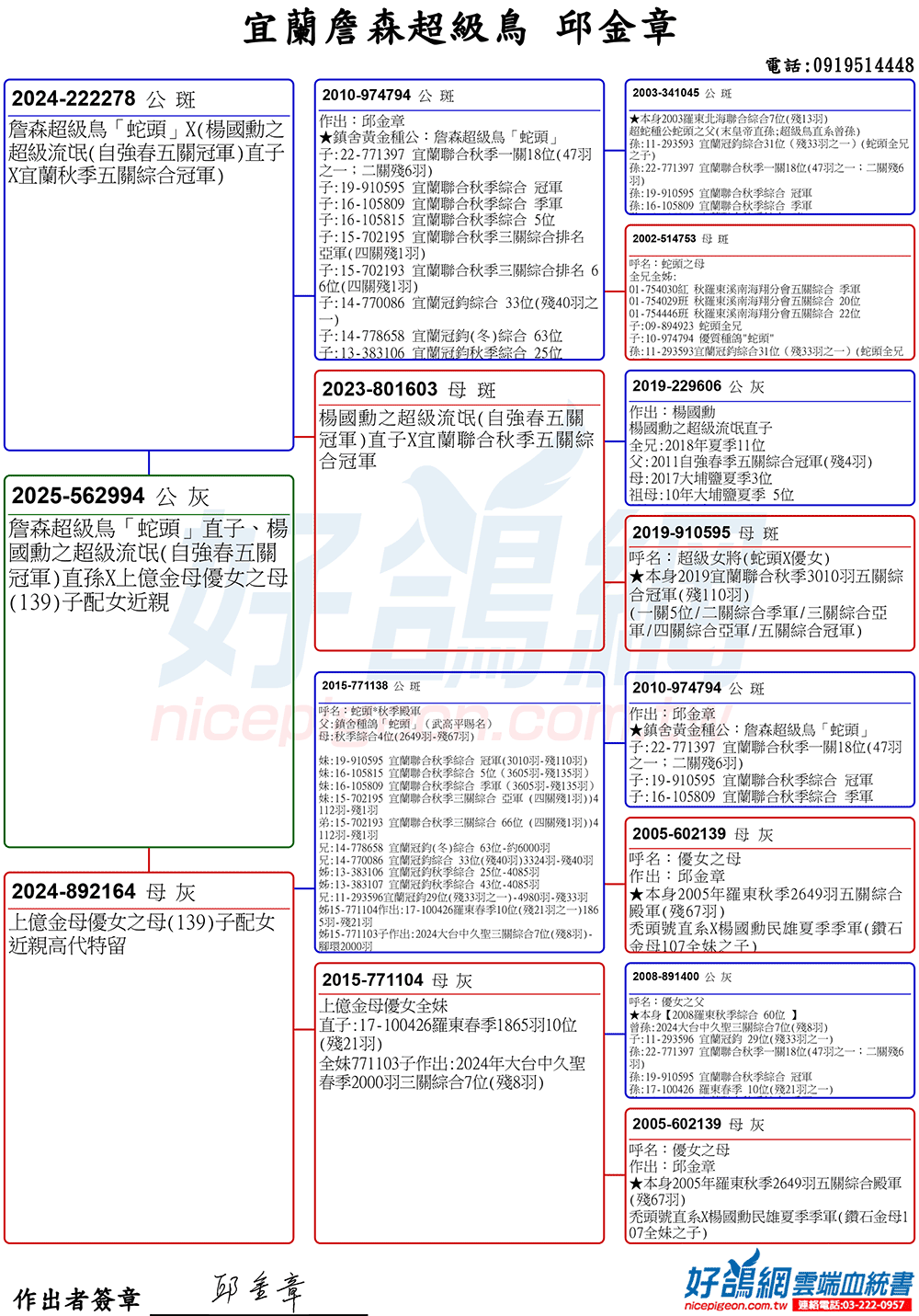 「超級鳥蛇頭」與「上億金母優女」這個黃金組合,為邱金章鴿舍打下穩固的基石,作出不計其數的入賞鴿,為邱金章的海翔成績取得巨大的成就。