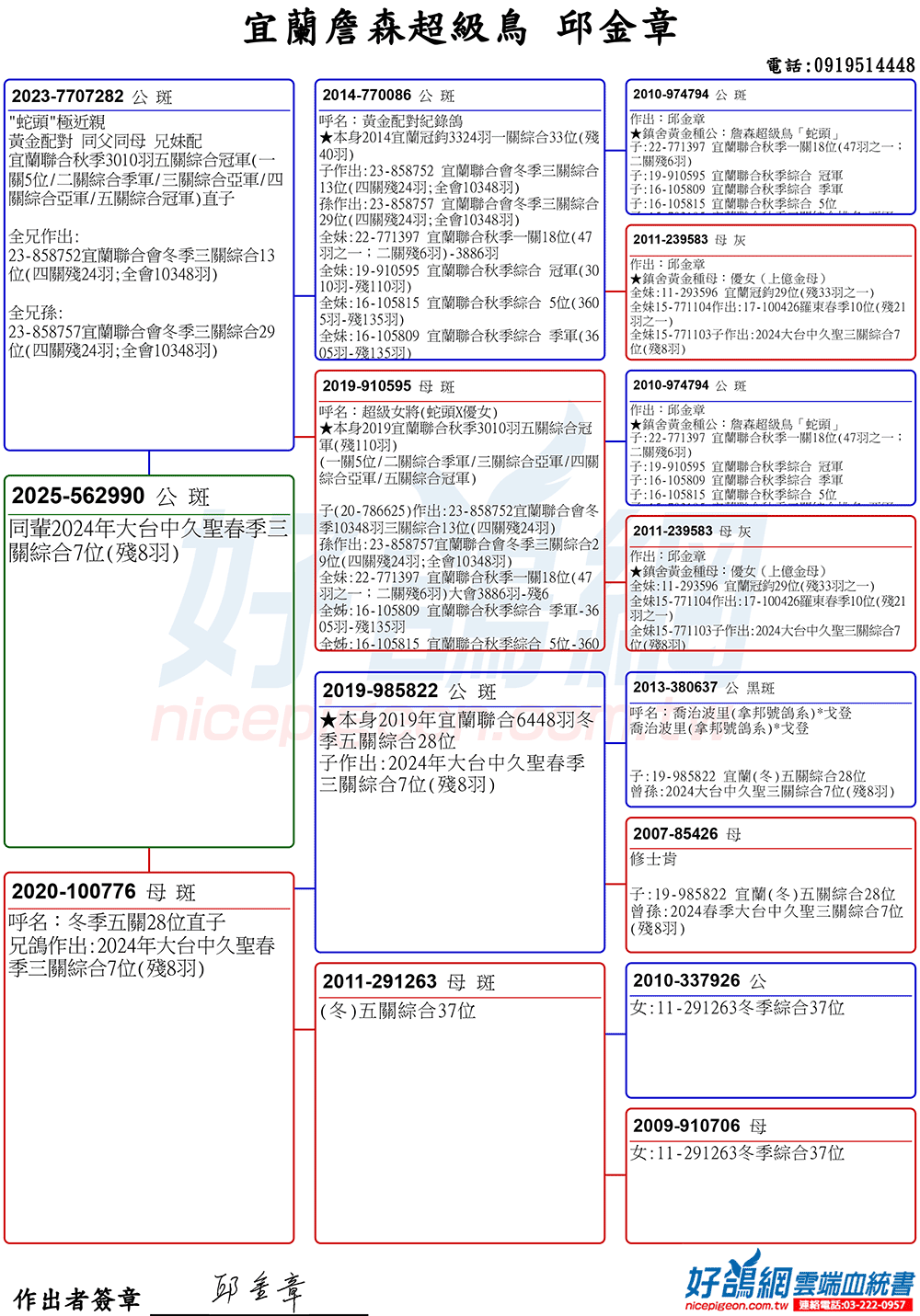 「超級鳥蛇頭」與「上億金母優女」這個黃金組合,為邱金章鴿舍打下穩固的基石,作出不計其數的入賞鴿,為邱金章的海翔成績取得巨大的成就。