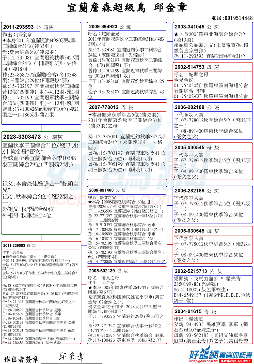 「超級鳥蛇頭」與「上億金母優女」這個黃金組合,為邱金章鴿舍打下穩固的基石,作出不計其數的入賞鴿,為邱金章的海翔成績取得巨大的成就。