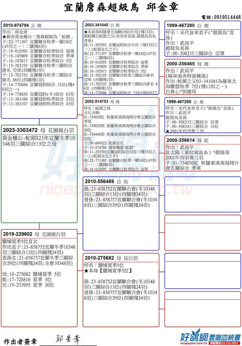 「超級鳥蛇頭」與「上億金母優女」這個黃金組合,為邱金章鴿舍打下穩固的基石,作出不計其數的入賞鴿,為邱金章的海翔成績取得巨大的成就。