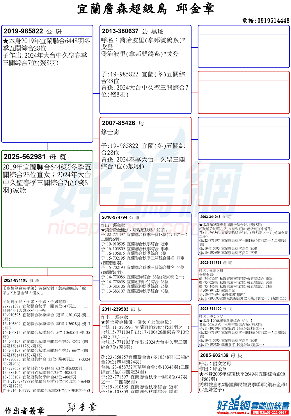 「超級鳥蛇頭」與「上億金母優女」這個黃金組合,為邱金章鴿舍打下穩固的基石,作出不計其數的入賞鴿,為邱金章的海翔成績取得巨大的成就。
