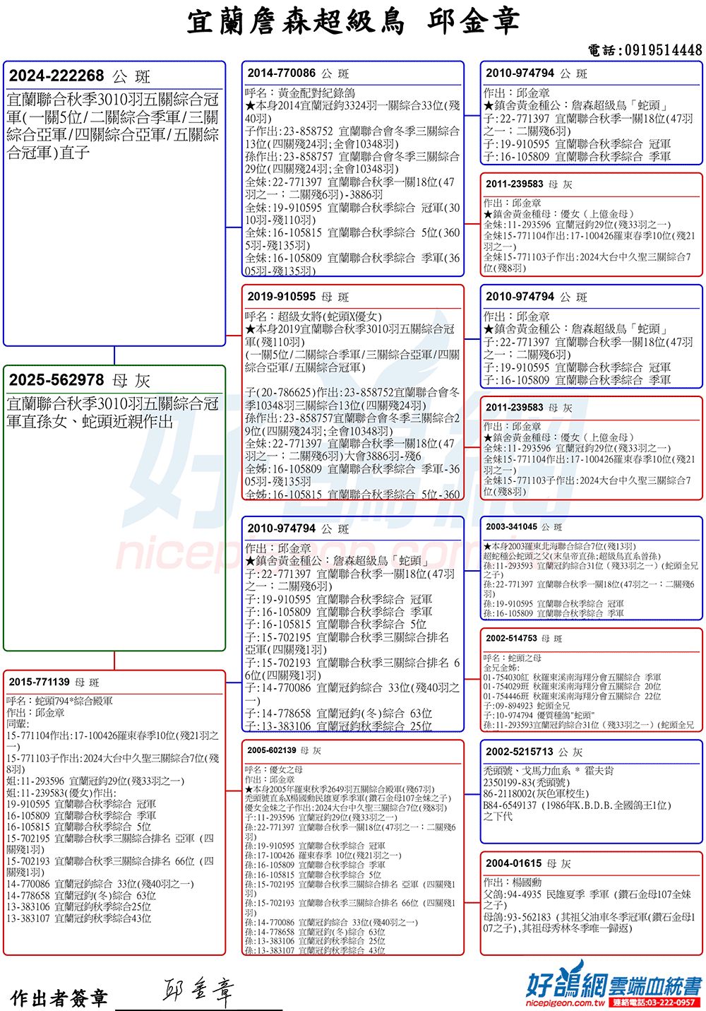 「超級鳥蛇頭」與「上億金母優女」這個黃金組合,為邱金章鴿舍打下穩固的基石,作出不計其數的入賞鴿,為邱金章的海翔成績取得巨大的成就。