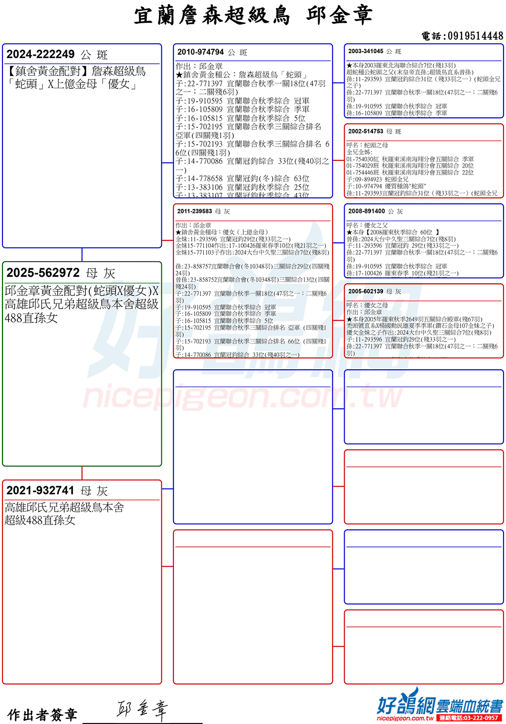 「超級鳥蛇頭」與「上億金母優女」這個黃金組合,為邱金章鴿舍打下穩固的基石,作出不計其數的入賞鴿,為邱金章的海翔成績取得巨大的成就。