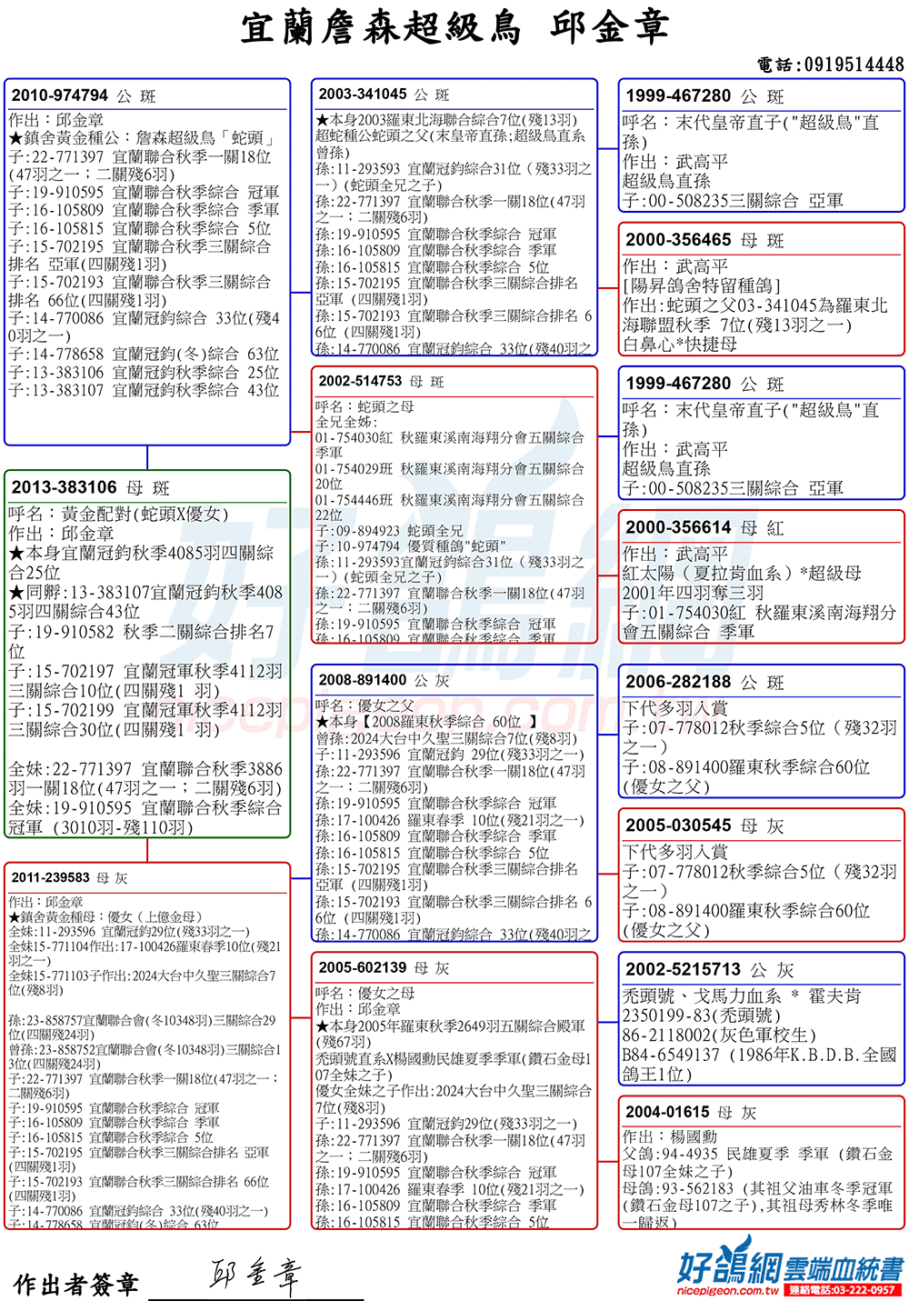 「超級鳥蛇頭」與「上億金母優女」這個黃金組合,為邱金章鴿舍打下穩固的基石,作出不計其數的入賞鴿,為邱金章的海翔成績取得巨大的成就。
