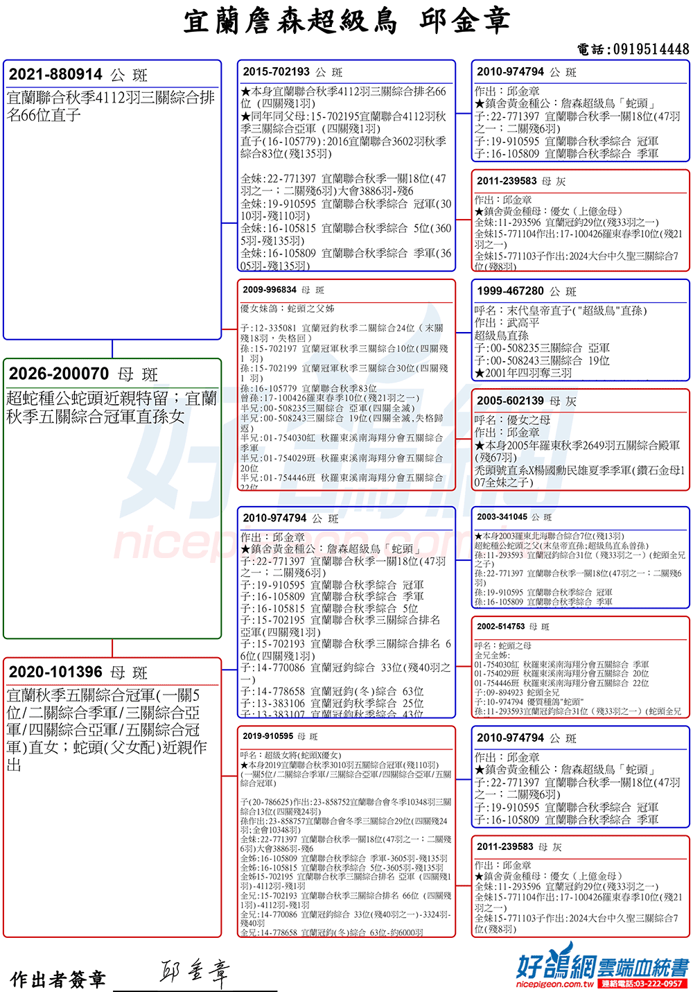 「超級鳥蛇頭」與「上億金母優女」這個黃金組合,為邱金章鴿舍打下穩固的基石,作出不計其數的入賞鴿,為邱金章的海翔成績取得巨大的成就。