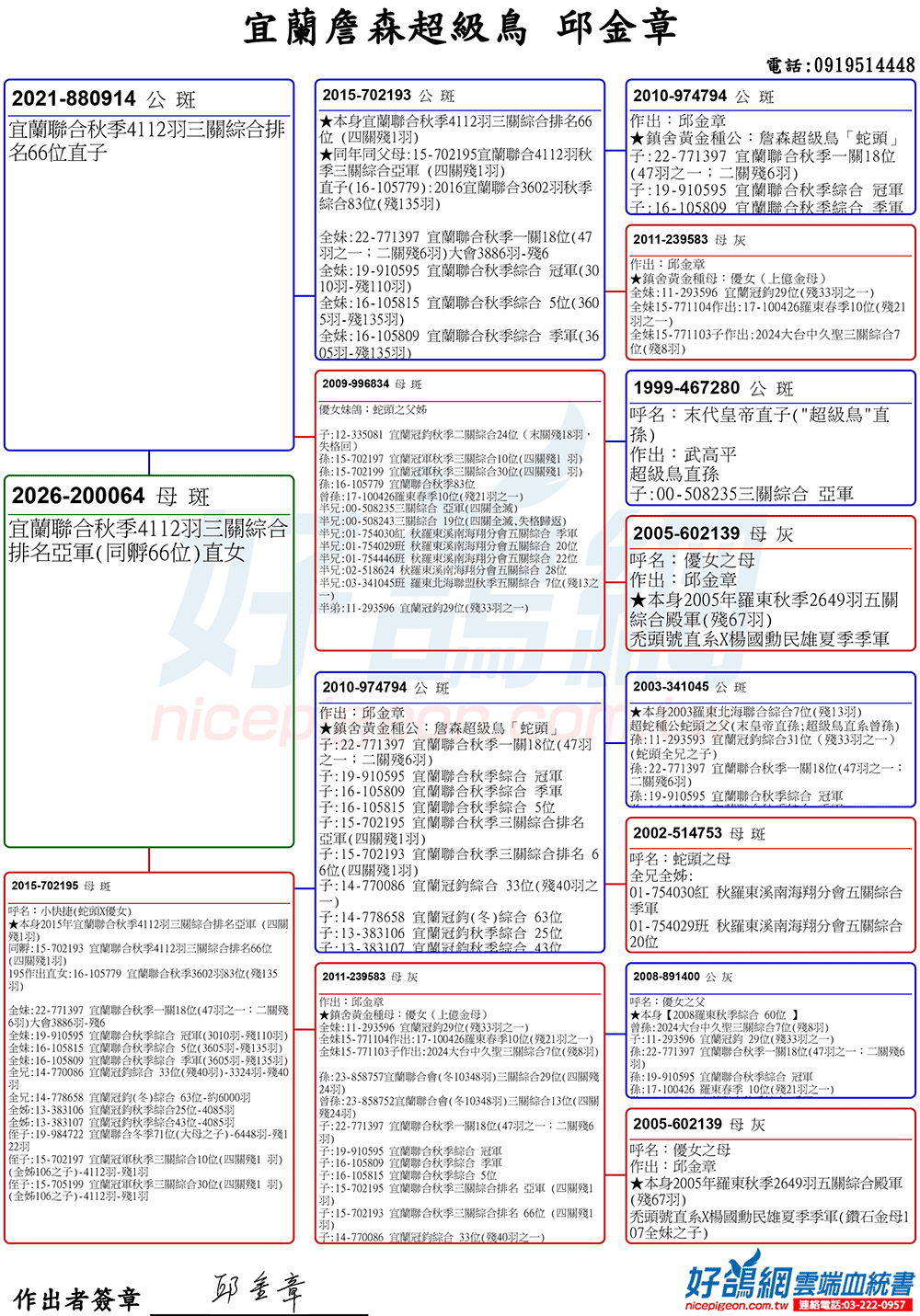 「超級鳥蛇頭」與「上億金母優女」這個黃金組合,為邱金章鴿舍打下穩固的基石,作出不計其數的入賞鴿,為邱金章的海翔成績取得巨大的成就。