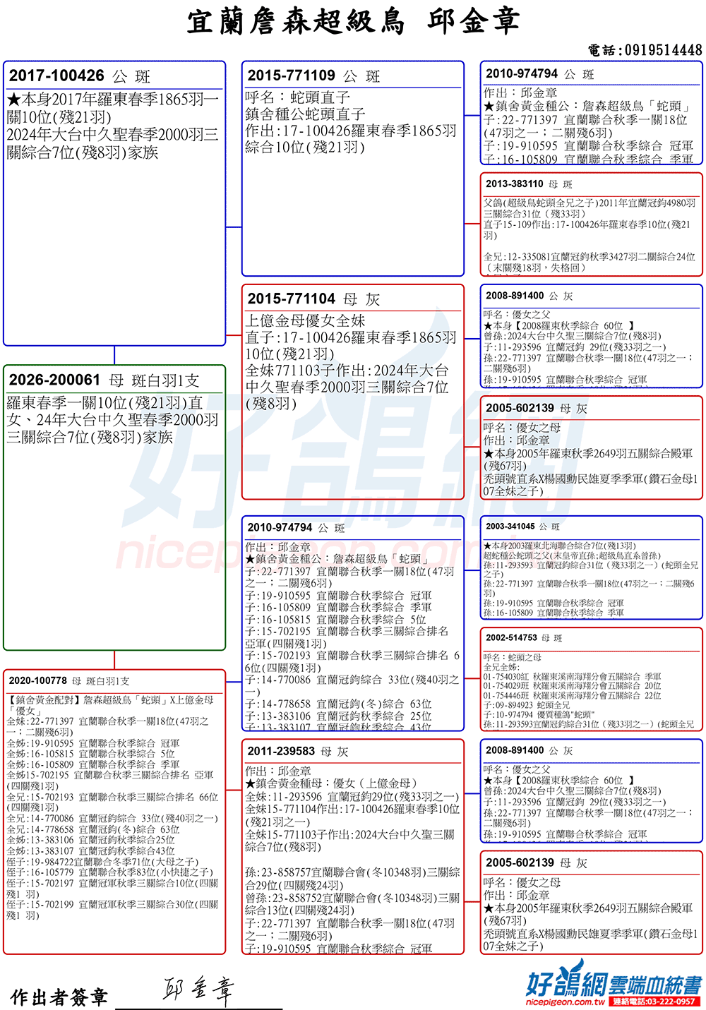 「超級鳥蛇頭」與「上億金母優女」這個黃金組合,為邱金章鴿舍打下穩固的基石,作出不計其數的入賞鴿,為邱金章的海翔成績取得巨大的成就。