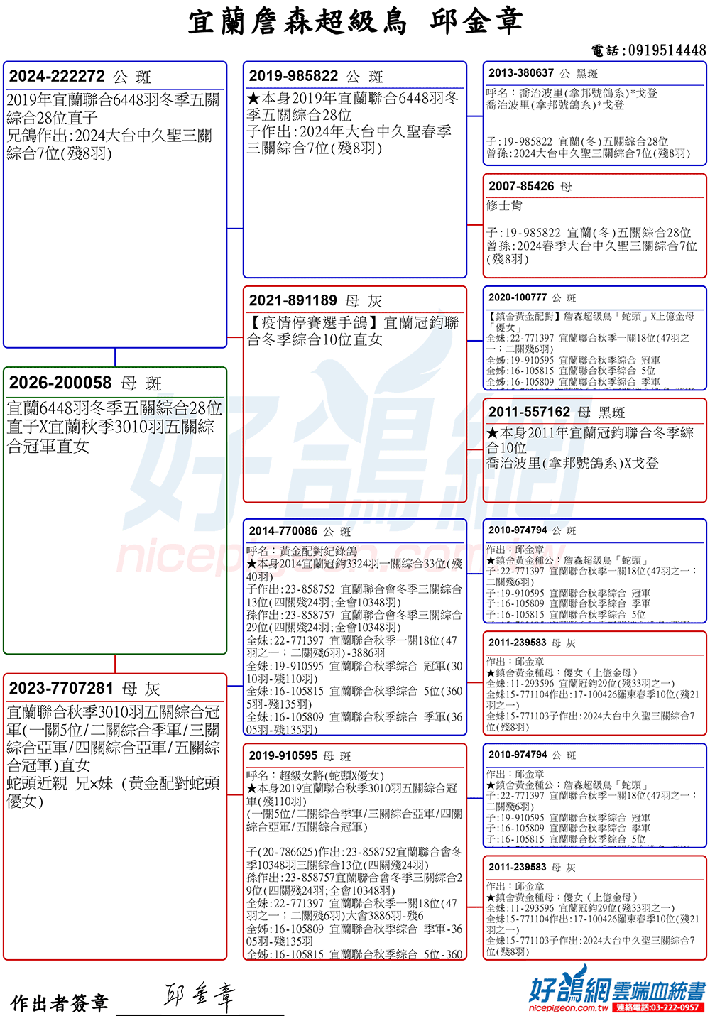 「超級鳥蛇頭」與「上億金母優女」這個黃金組合,為邱金章鴿舍打下穩固的基石,作出不計其數的入賞鴿,為邱金章的海翔成績取得巨大的成就。