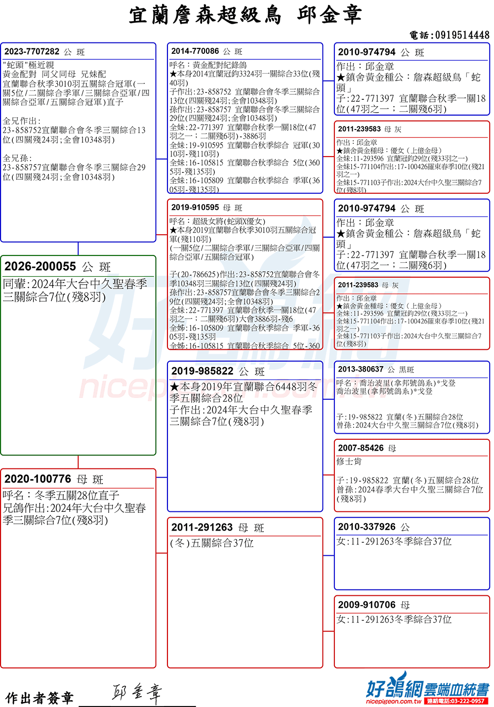 「超級鳥蛇頭」與「上億金母優女」這個黃金組合,為邱金章鴿舍打下穩固的基石,作出不計其數的入賞鴿,為邱金章的海翔成績取得巨大的成就。