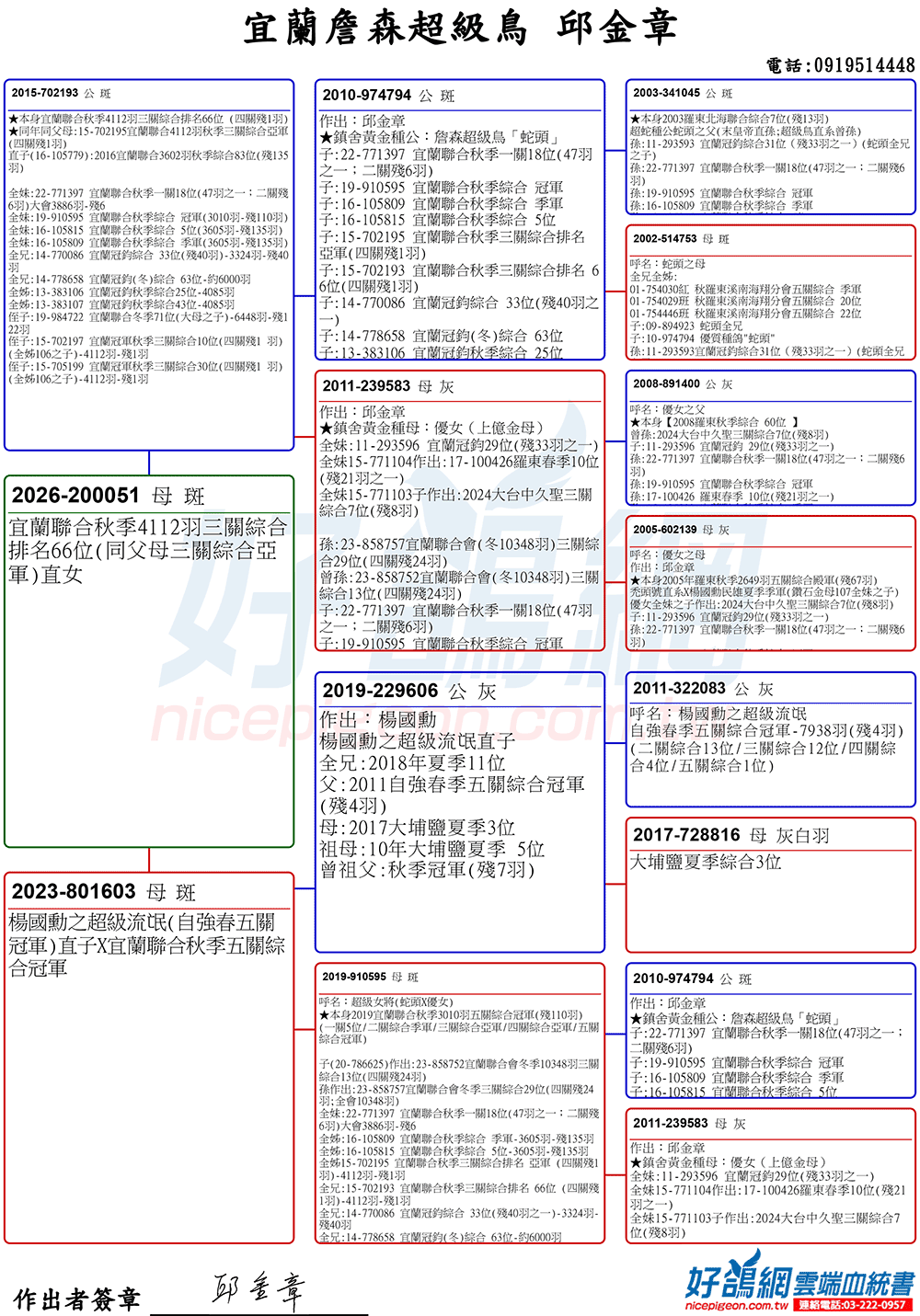 「超級鳥蛇頭」與「上億金母優女」這個黃金組合,為邱金章鴿舍打下穩固的基石,作出不計其數的入賞鴿,為邱金章的海翔成績取得巨大的成就。