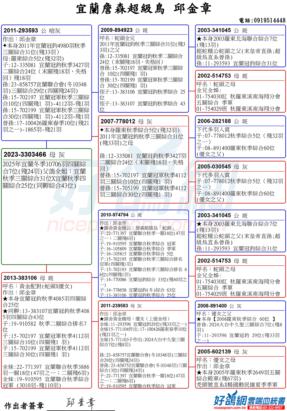 「超級鳥蛇頭」與「上億金母優女」這個黃金組合,為邱金章鴿舍打下穩固的基石,作出不計其數的入賞鴿,為邱金章的海翔成績取得巨大的成就。