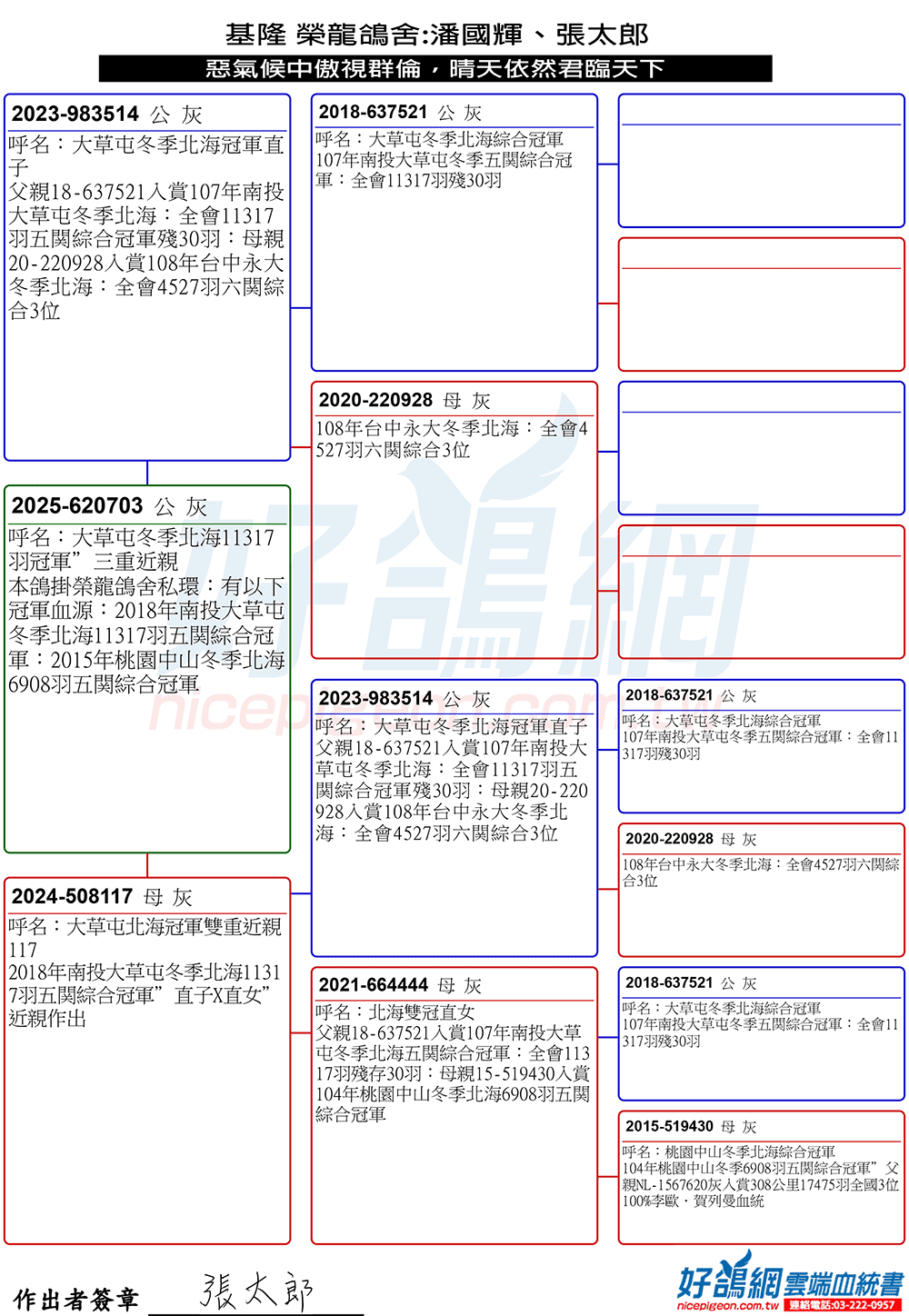 2023年春季北海宜蘭聯合會全會7165羽殘34羽,由基隆榮龍鴿舍潘國輝.張太郎作出23-762818灰母(使翔:邱宏宜,教練:陳志翔),入賞三關綜合14位。