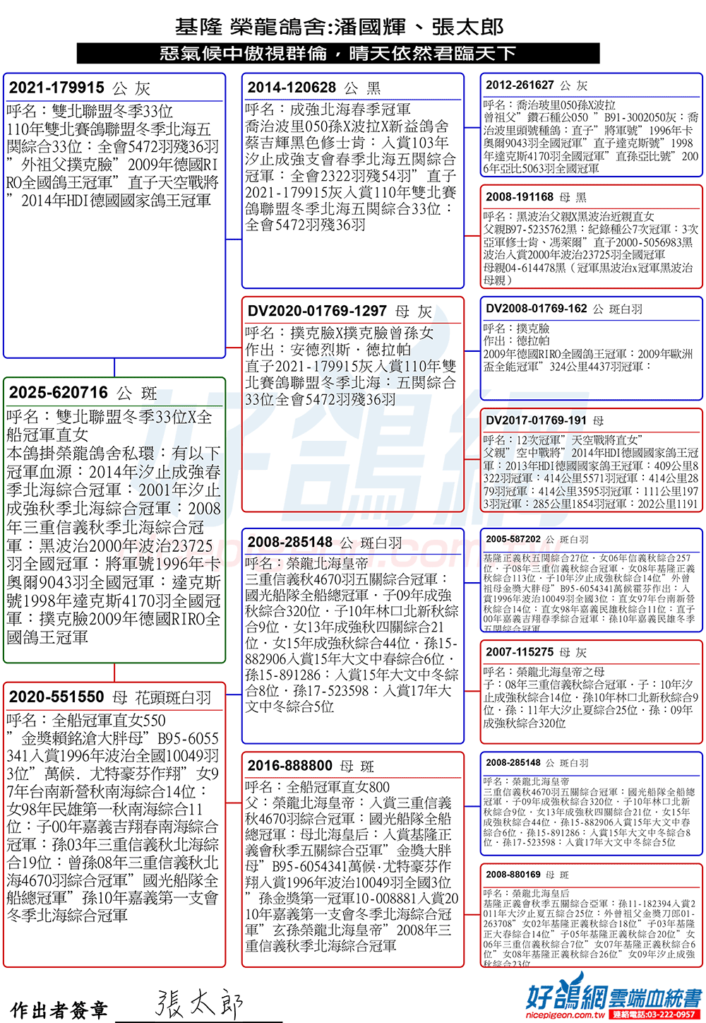 據了解,榮龍鴿舍現役育種主力,包括三重信義秋季五關綜合冠軍,國光船隊全船總冠軍,汐止成強秋季綜合冠軍,大新泰春季綜合冠軍之外,近期更是導入多羽戰功彪炳的實戰綜合冠軍直子女,包括大北區春季13630羽殘66羽五關綜合冠軍,北海船隊全船總冠軍直女,嘉義民雄第一支會冬季3115羽殘35羽五關綜合冠軍,全船總冠軍直女,雙北聯盟夏季3456羽殘3羽伯馬四關綜合冠軍,大草屯冬季11317羽殘30羽五關綜合冠軍直子女,竹南大新冬季2677羽殘3羽伯馬六關綜合冠軍直女,南臺灣夏季七關綜合冠軍直女,彰化大埔塩冬季6338羽殘30羽五關綜合冠軍直女。