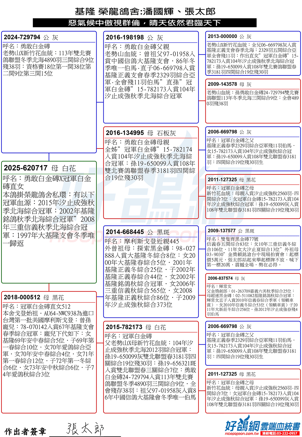 2023年春季北海宜蘭聯合會全會7165羽殘34羽,由基隆榮龍鴿舍潘國輝.張太郎作出23-762818灰母(使翔:邱宏,教練:陳志翔),入賞三關綜合14位。
