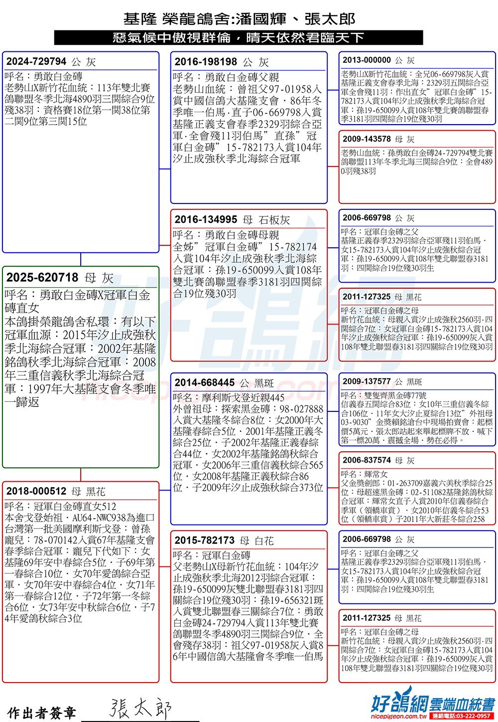 據了解,榮龍鴿舍現役育種主力,包括三重信義秋季五關綜合冠軍,國光船隊全船總冠軍,汐止成強秋季綜合冠軍,大新泰春季綜合冠軍之外,近期更是導入多羽戰功彪炳的實戰綜合冠軍直子女,包括大北區春季13630羽殘66羽五關綜合冠軍,北海船隊全船總冠軍直女,嘉義民雄第一支會冬季3115羽殘35羽五關綜合冠軍,全船總冠軍直女,雙北聯盟夏季3456羽殘3羽伯馬四關綜合冠軍,大草屯冬季11317羽殘30羽五關綜合冠軍直子女,竹南大新冬季2677羽殘3羽伯馬六關綜合冠軍直女,南臺灣夏季七關綜合冠軍直女,彰化大埔塩冬季6338羽殘30羽五關綜合冠軍直女。