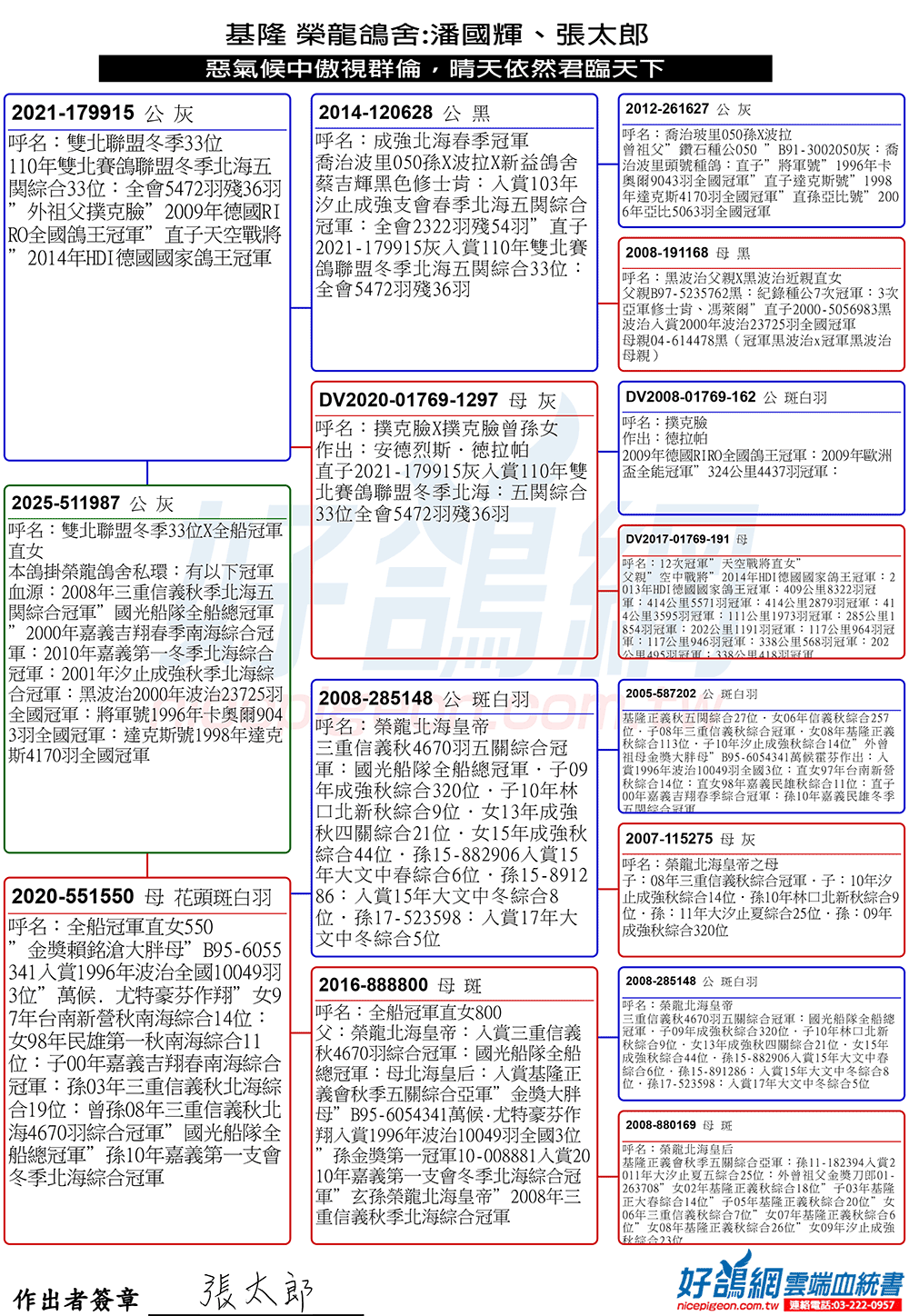 據了解,榮龍鴿舍現役育種主力,包括三重信義秋季五關綜合冠軍,國光船隊全船總冠軍,汐止成強秋季綜合冠軍,大新泰春季綜合冠軍之外,近期更是導入多羽戰功彪炳的實戰綜合冠軍直子女,包括大北區春季13630羽殘66羽五關綜合冠軍,北海船隊全船總冠軍直女,嘉義民雄第一支會冬季3115羽殘35羽五關綜合冠軍,全船總冠軍直女,雙北聯盟夏季3456羽殘3羽伯馬四關綜合冠軍,大草屯冬季11317羽殘30羽五關綜合冠軍直子女,竹南大新冬季2677羽殘3羽伯馬六關綜合冠軍直女,南臺灣夏季七關綜合冠軍直女,彰化大埔塩冬季6338羽殘30羽五關綜合冠軍直女。