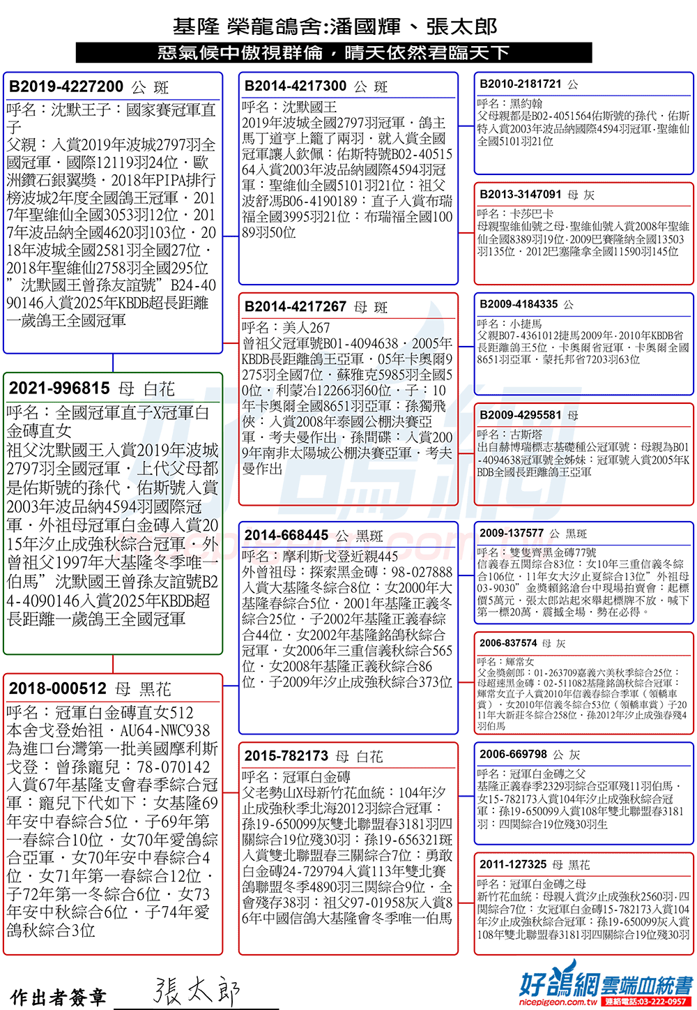 據了解,榮龍鴿舍現役育種主力,包括三重信義秋季五關綜合冠軍,國光船隊全船總冠軍,汐止成強秋季綜合冠軍,大新泰春季綜合冠軍之外,近期更是導入多羽戰功彪炳的實戰綜合冠軍直子女,包括大北區春季13630羽殘66羽五關綜合冠軍,北海船隊全船總冠軍直女,嘉義民雄第一支會冬季3115羽殘35羽五關綜合冠軍,全船總冠軍直女,雙北聯盟夏季3456羽殘3羽伯馬四關綜合冠軍,大草屯冬季11317羽殘30羽五關綜合冠軍直子女,竹南大新冬季2677羽殘3羽伯馬六關綜合冠軍直女,南臺灣夏季七關綜合冠軍直女,彰化大埔塩冬季6338羽殘30羽五關綜合冠軍直女。