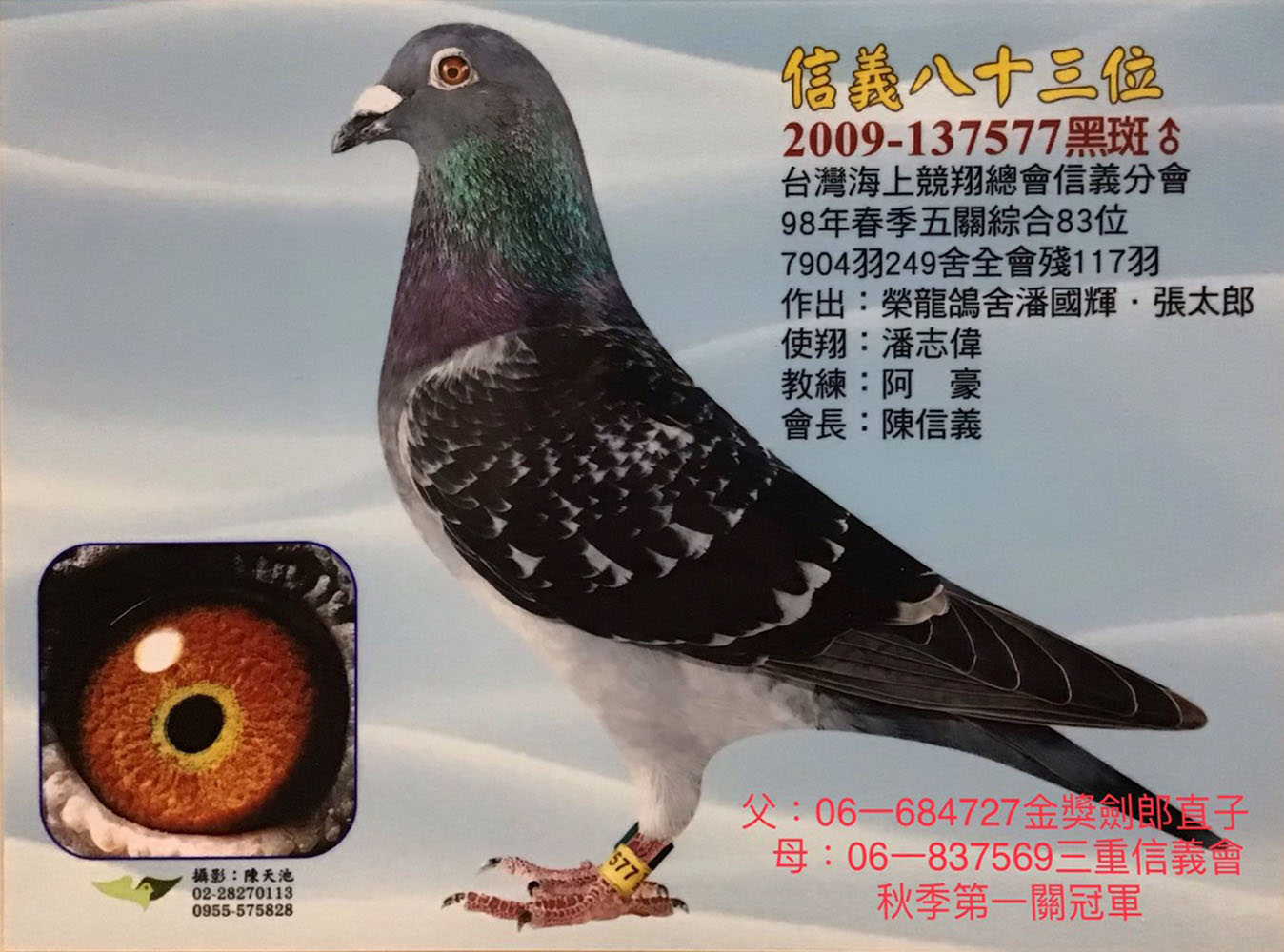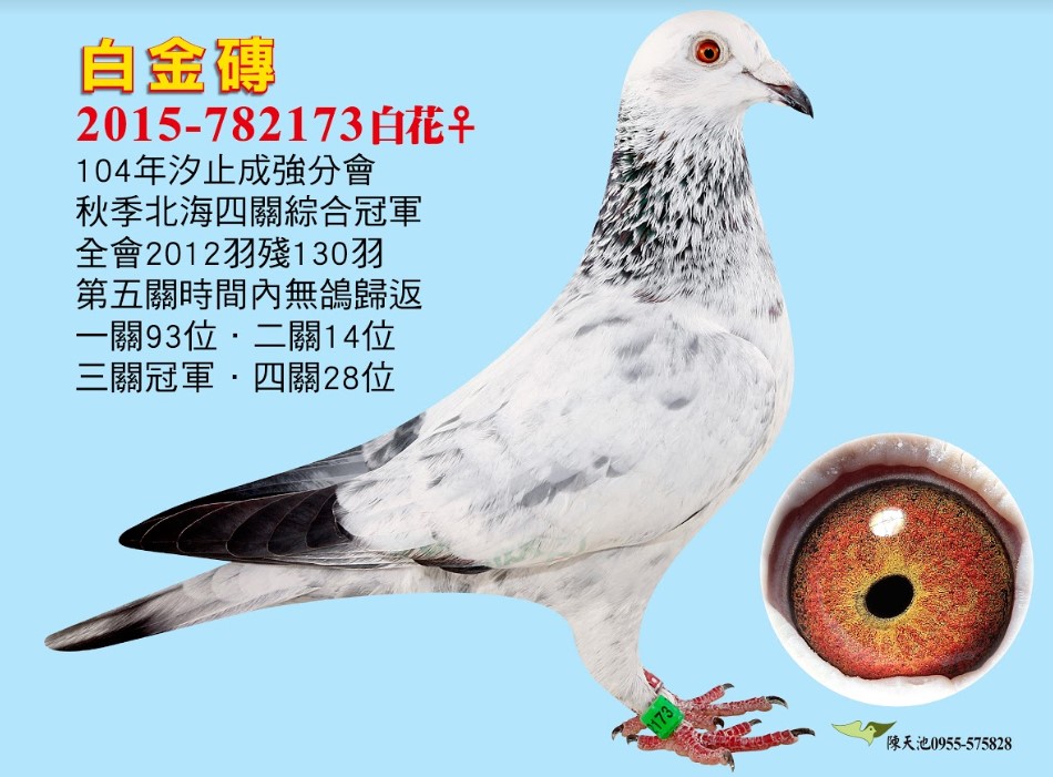 2023年春季北海宜蘭聯合會全會7165羽殘34羽,由基隆榮龍鴿舍潘國輝.張太郎作出23-762818灰母(使翔:邱宏宜,教練:陳志翔),入賞三關綜合14位。