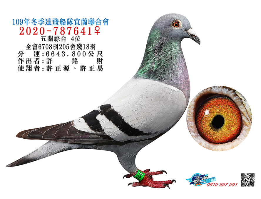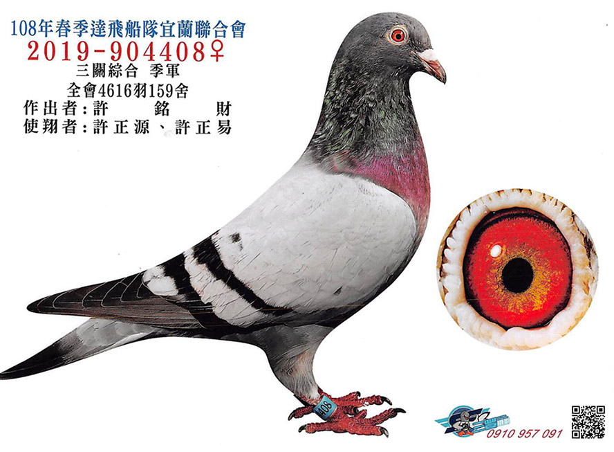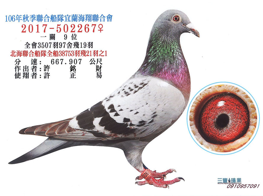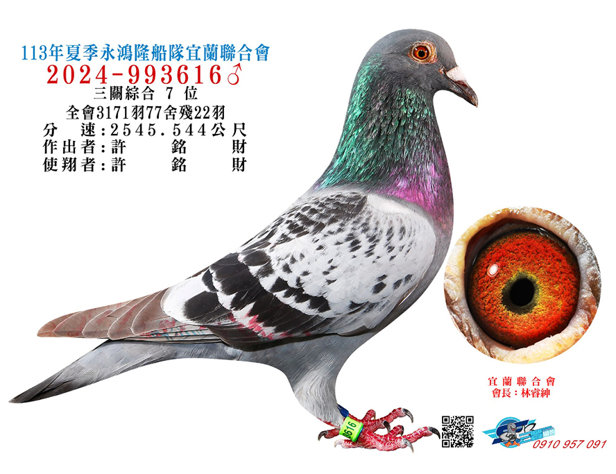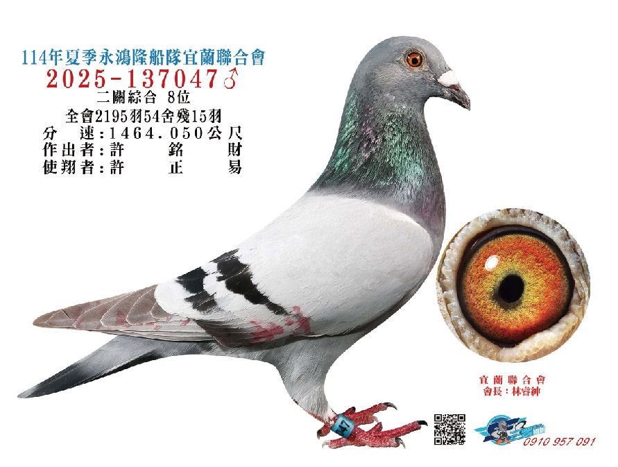 2025年夏季宜蘭聯合會二關綜合8位,環號25-137047灰♂,其父鴿24-993616斑♂,本身入賞夏季三關綜合7位(群益冠軍家族X小火箭三冠家族),母親24-333022,血統為夏季三關綜合亞軍全妹(雙伯馬家族X哈利近親)所作出,許銘財又一次以實戰成績印證了優質血統一脈相承的可貴。