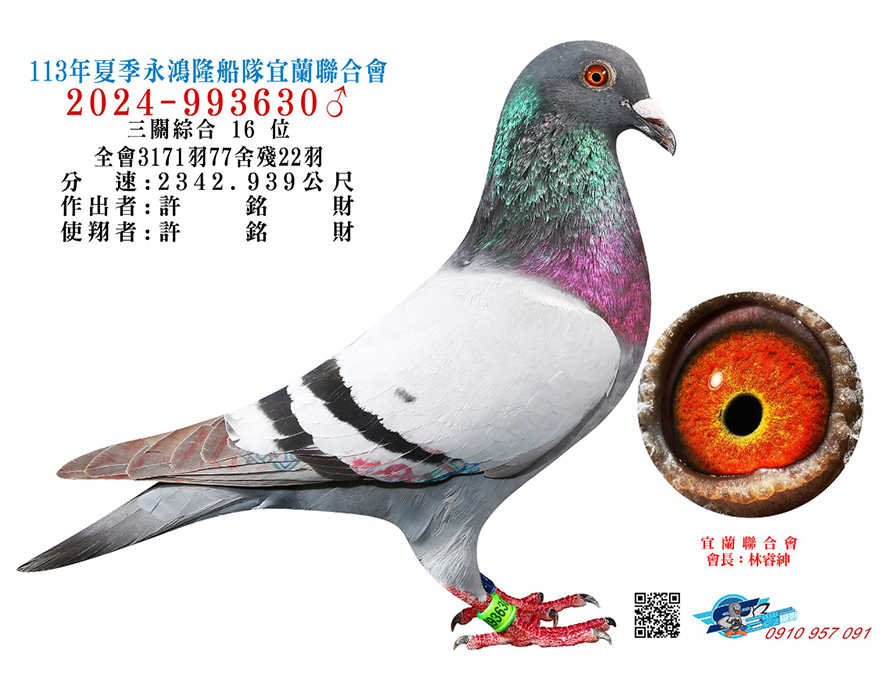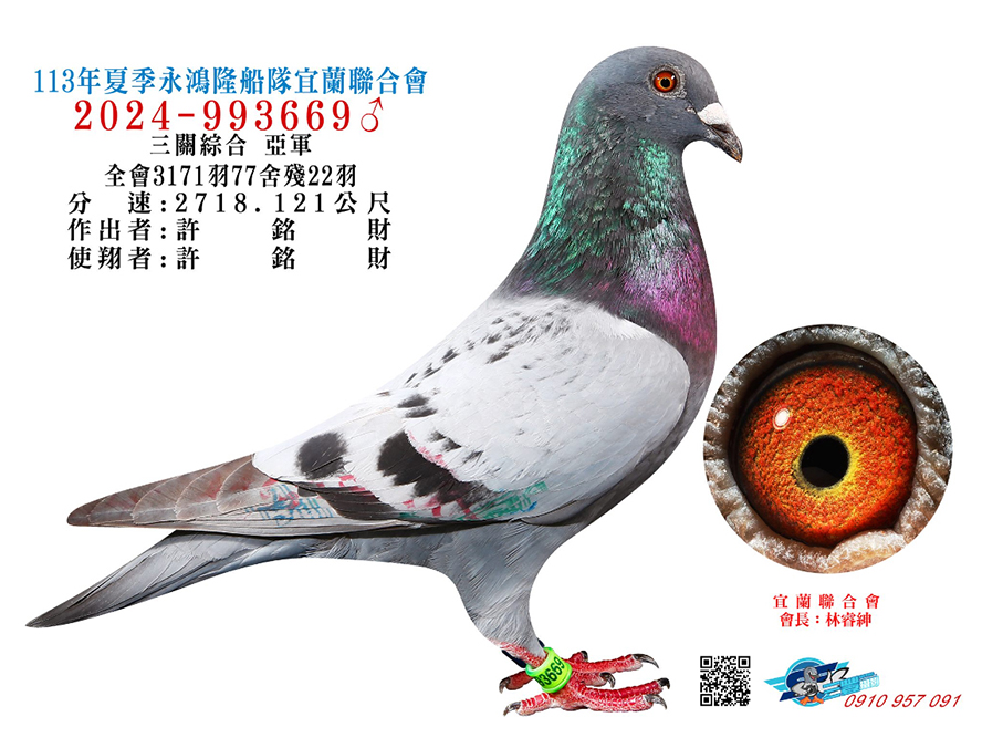 繼2024年夏季宜蘭聯合會,全會3171羽三關殘22羽獨佔3羽,分別入賞三關綜合亞軍,環號24-993669斑♂,血統出自雙伯馬直子X哈利下代、三關綜合7位,環號24-993616斑♂,血統出自群益冠軍下代X小火箭三冠家族、三關綜合16位,環號24-993630灰♂,血統為迪布恩阿里X哈利近親,聲名大噪震撼北海競翔圈。