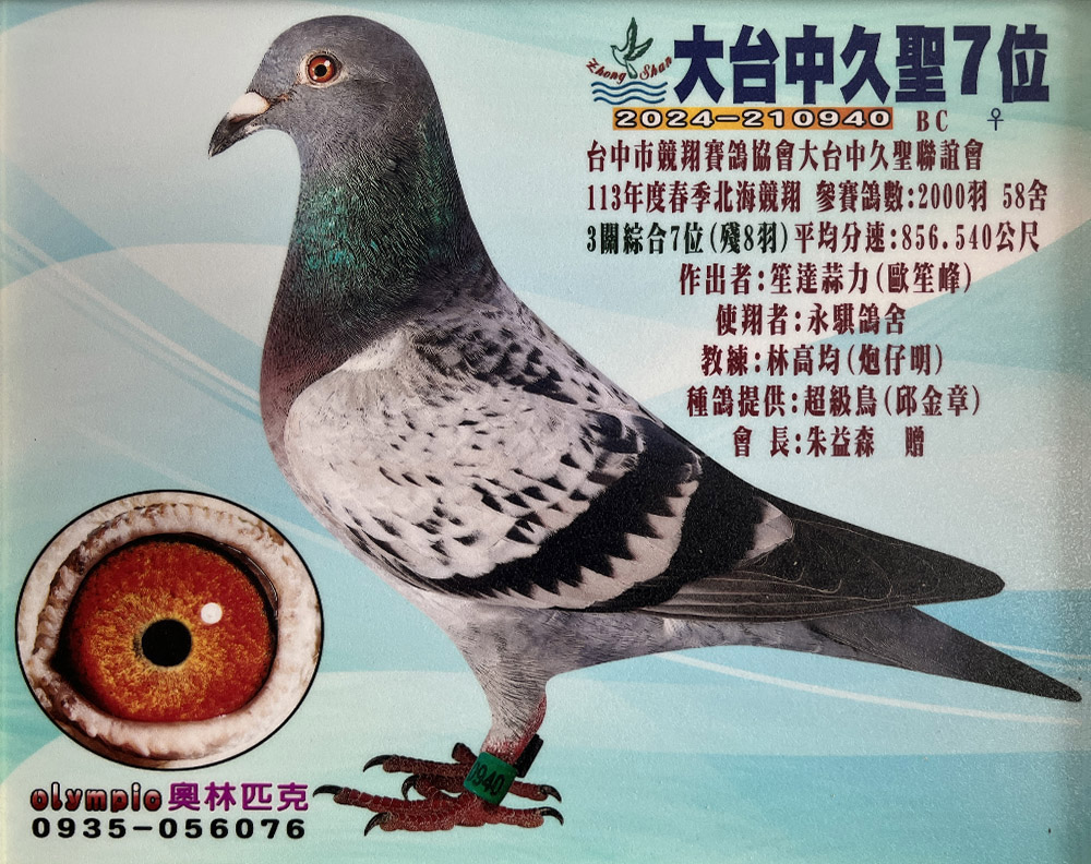 這組黃金配對,不只是宜蘭地區發揮,在2024年大台中久聖春季三關綜合7位(種鴿提供)的殘8羽賽事中也取得優異的成績。