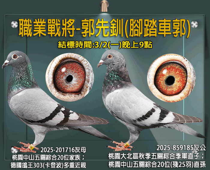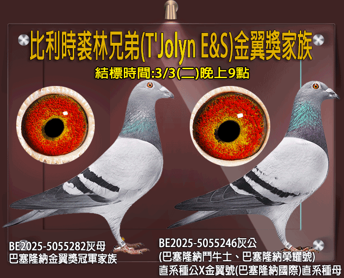 2026/02/25-03/03比利時裘林兄弟(T'Jolyn E&S)金翼獎家族《鴿在歐洲,得標需支付每羽國際運費新台幣$10,500元,運輸時程較長(約2-4個月),請耐心等候!》