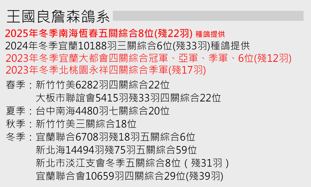 【鴿主推薦】佰萬種公(詹森白羽號)原配對近親家族