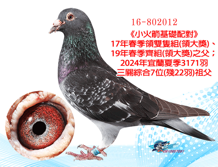 《小火箭基礎配對》17年春季領雙隻組(領大獎)、19年春季齊組(領大獎)之父;2024年宜蘭夏季3171羽三關綜合7位(殘22羽)祖父