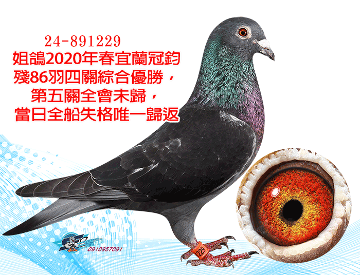姐鴿2020年春宜蘭冠鈞殘86羽四關綜合優勝,第五關全會未歸,當日全船失格唯一歸返