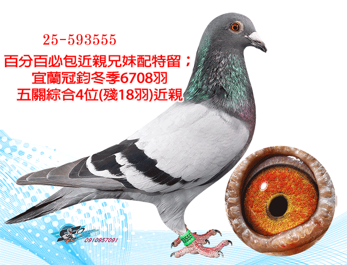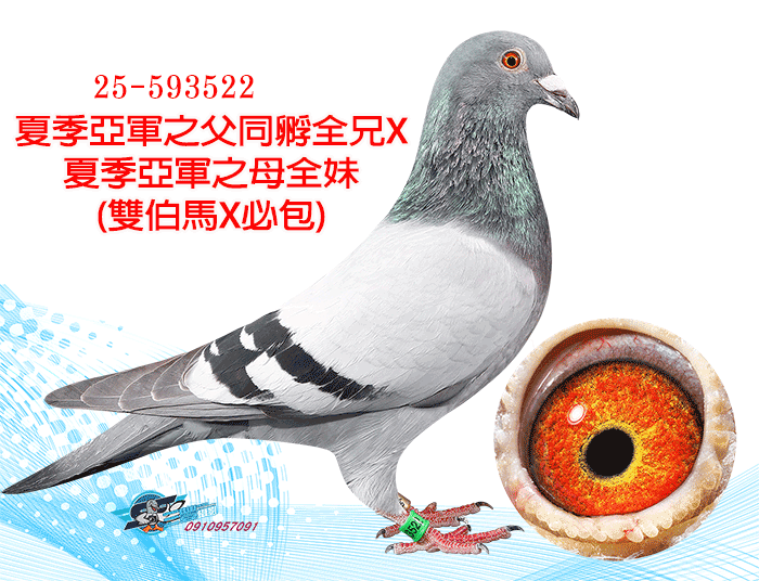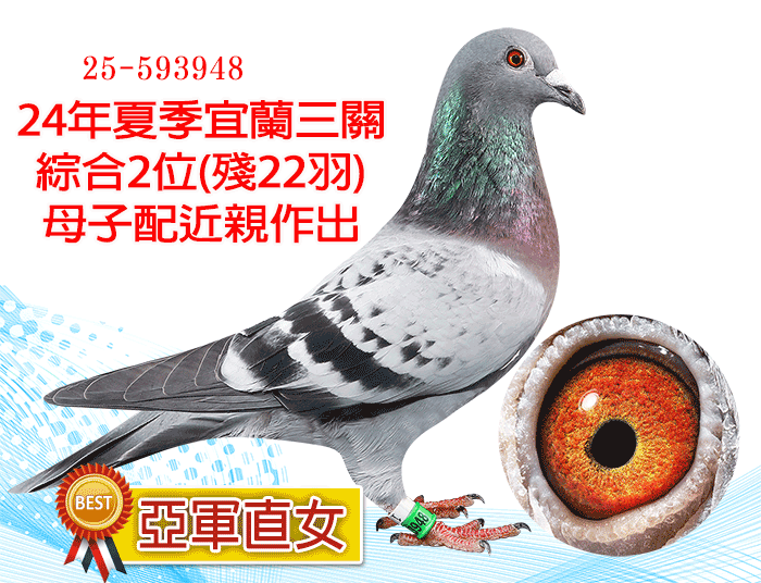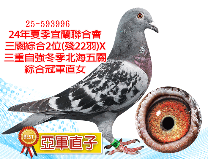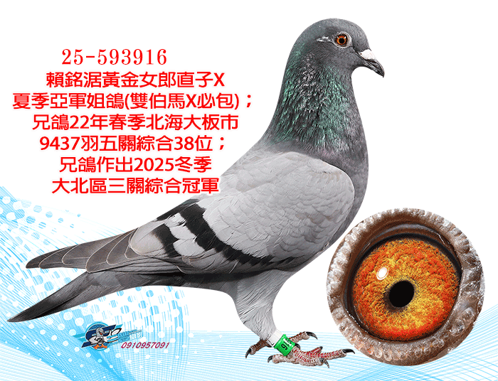 賴銘涺黃金女郎直子X夏季亞軍姐鴿(雙伯馬X必包);兄鴿22年春季北海大板市9437羽五關綜合38位;兄鴿作出2025冬季大北區三關綜合冠軍