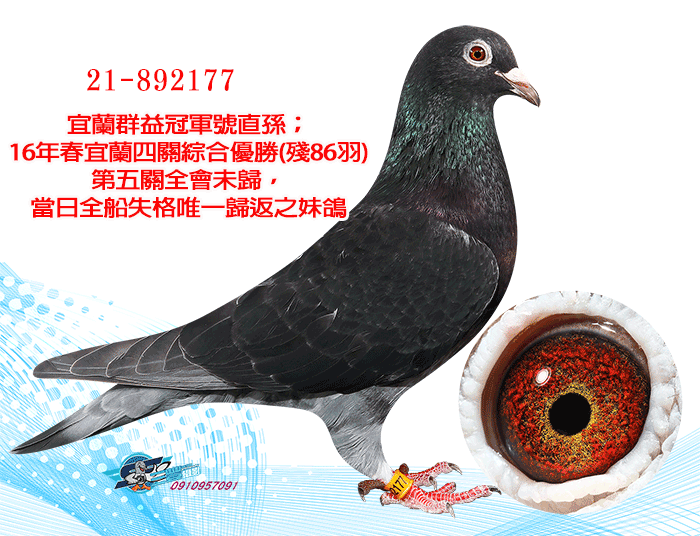 宜蘭群益冠軍號直孫;16年春宜蘭四關綜合優勝(殘86羽)第五關全會未歸,當日全船失格唯一歸返之妹鴿
