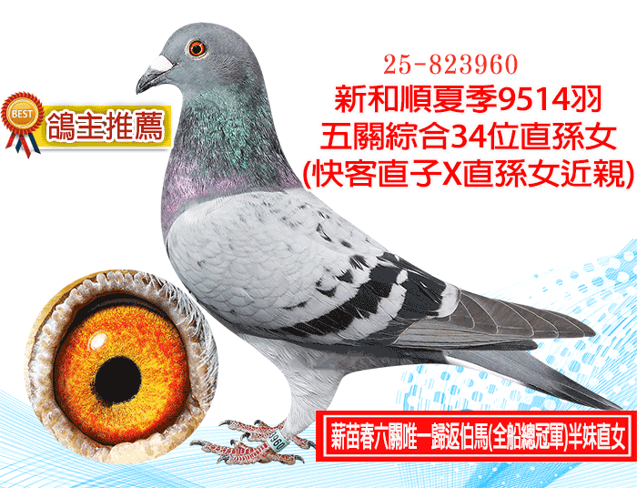 【鴿主推薦】新和順夏季9514羽五關綜合34位直孫女(快客直子X直孫女近親);薪苗春六關唯一歸返伯馬(全船總冠軍)半妹直女