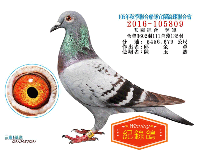 【紀錄鴿】本身2016年宜蘭秋季3605羽五關綜合季軍;全姐:16年宜蘭秋季五關綜合5位、全妹宜蘭秋季綜合冠軍