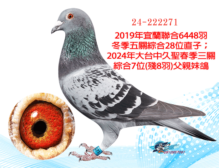 2019年宜蘭聯合6448羽冬季五關綜合28位直子;2024年大台中久聖春季三關綜合7位(殘8羽)父親妹鴿