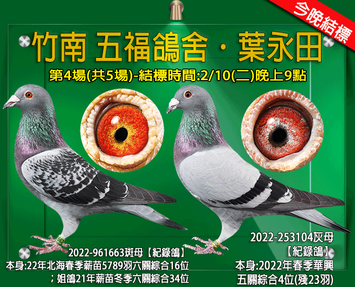 2026/02/04-02/10【全舍出清66-87】竹南五福鴿舍.葉永田(4)《清舍無法退換鴿,請謹慎下標!》《※此次1-5場拍賣得標後於02/25寄鴿》