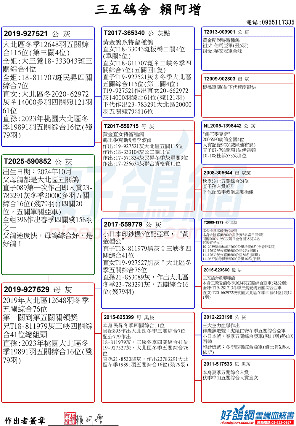三五鴿舍賴阿增憑藉著已適應台灣氣候又易於融合的本土鴿系,以這四大支柱為基礎,四大鴿系彼此融合性強,兼具速度及適應惡劣氣候的特性,多年來不混入另外的鴿系以自己的紀錄鴿配紀錄鴿,實戰紀錄加上彼此融合的血系早已自成一格,三五鴿系才得以不斷創造佳績的。